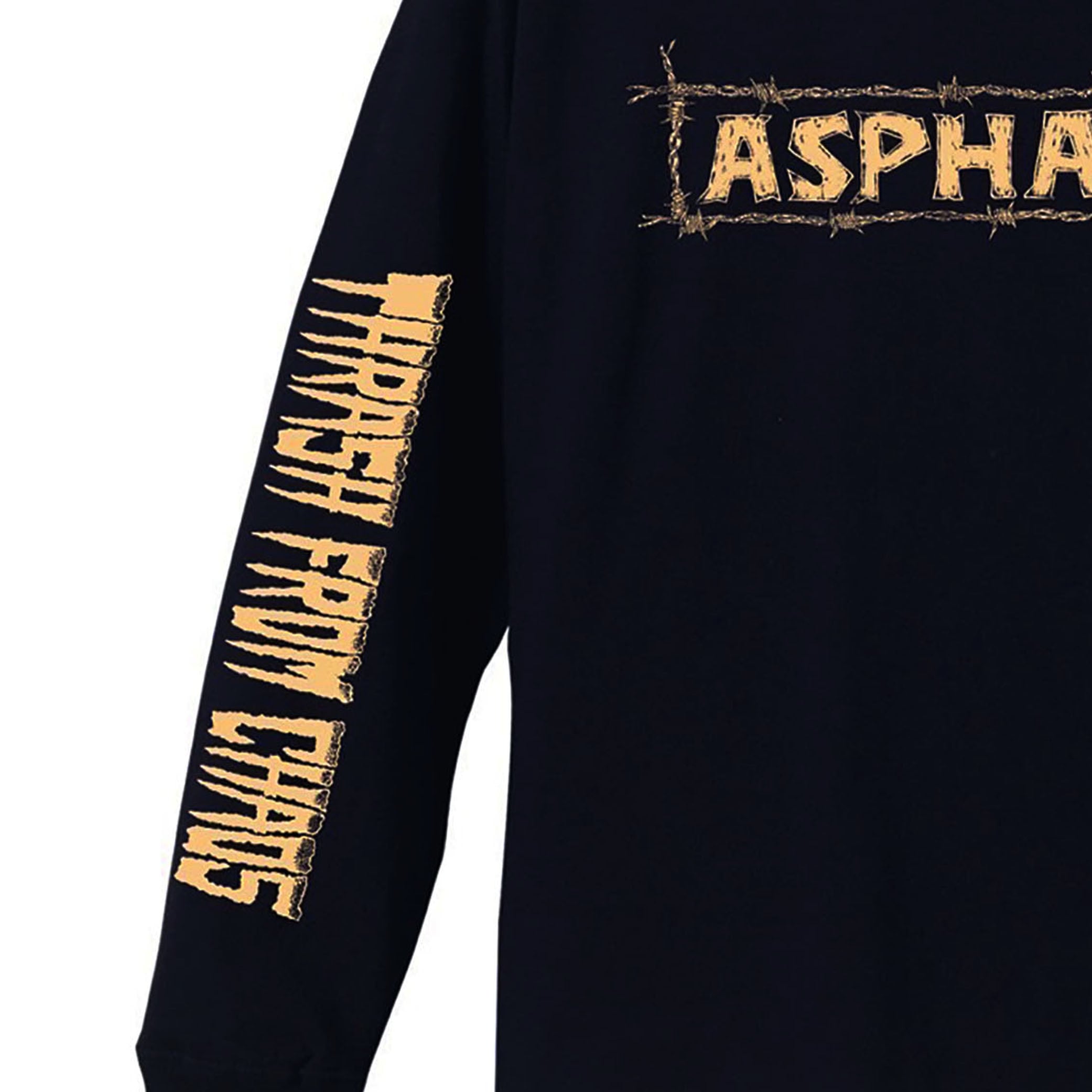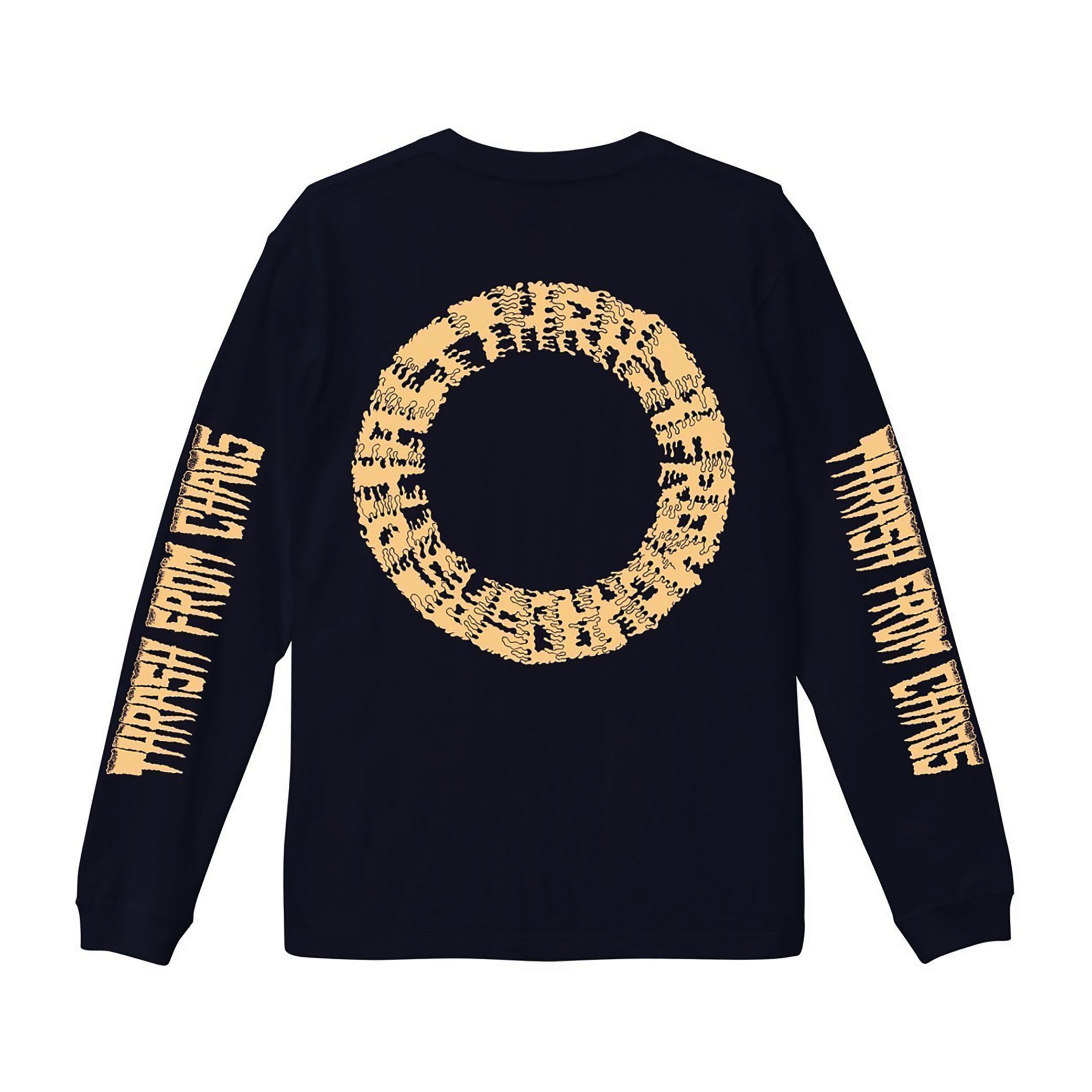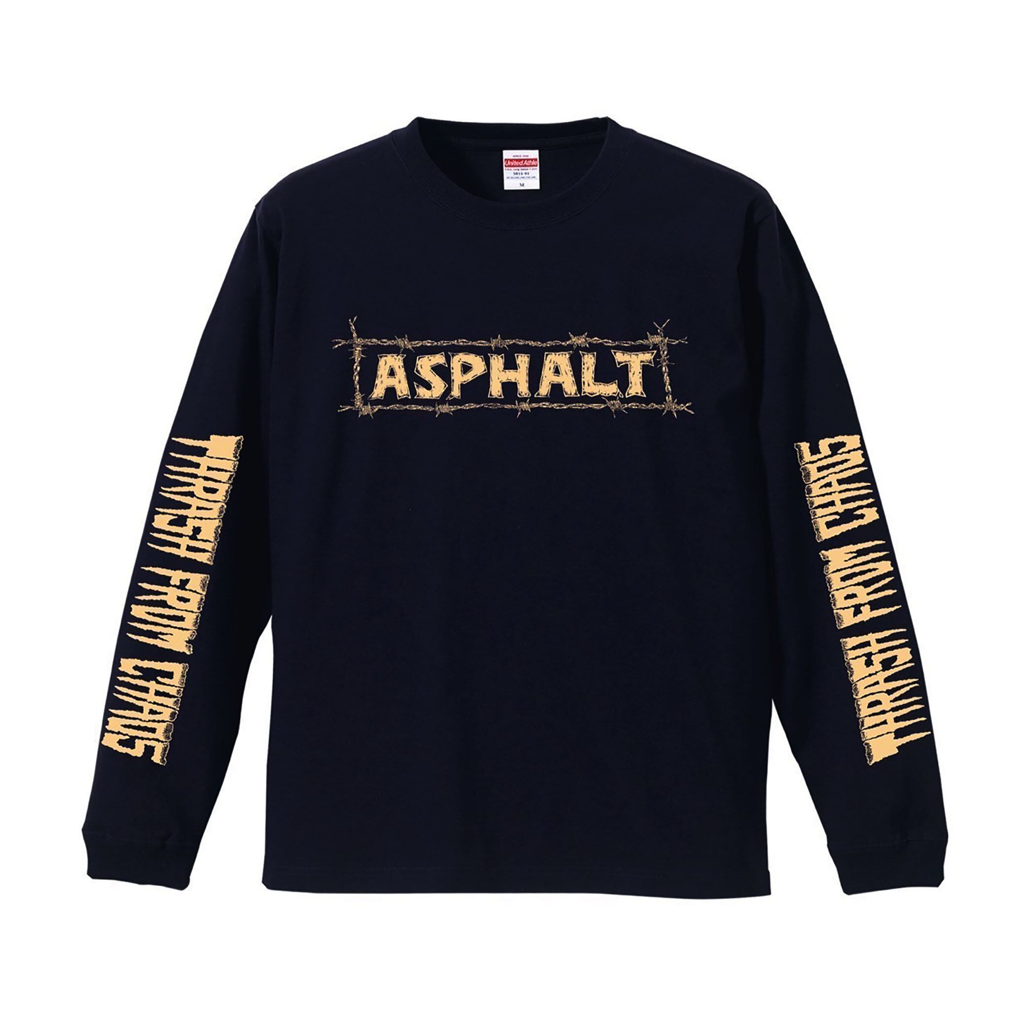 BAD BRAINSよろしく、雷に打たれ突如、筆をとり始めたヤスキ(GODDAMN DA HAA)による新作デザイン「パーフェクトサークル」をバックに、フロント「ASPHALT クラシックロゴ リメイク」、両袖には「THRASH FROM CHAOS」ロゴを配した豪華プリント・ロングスリーブT!