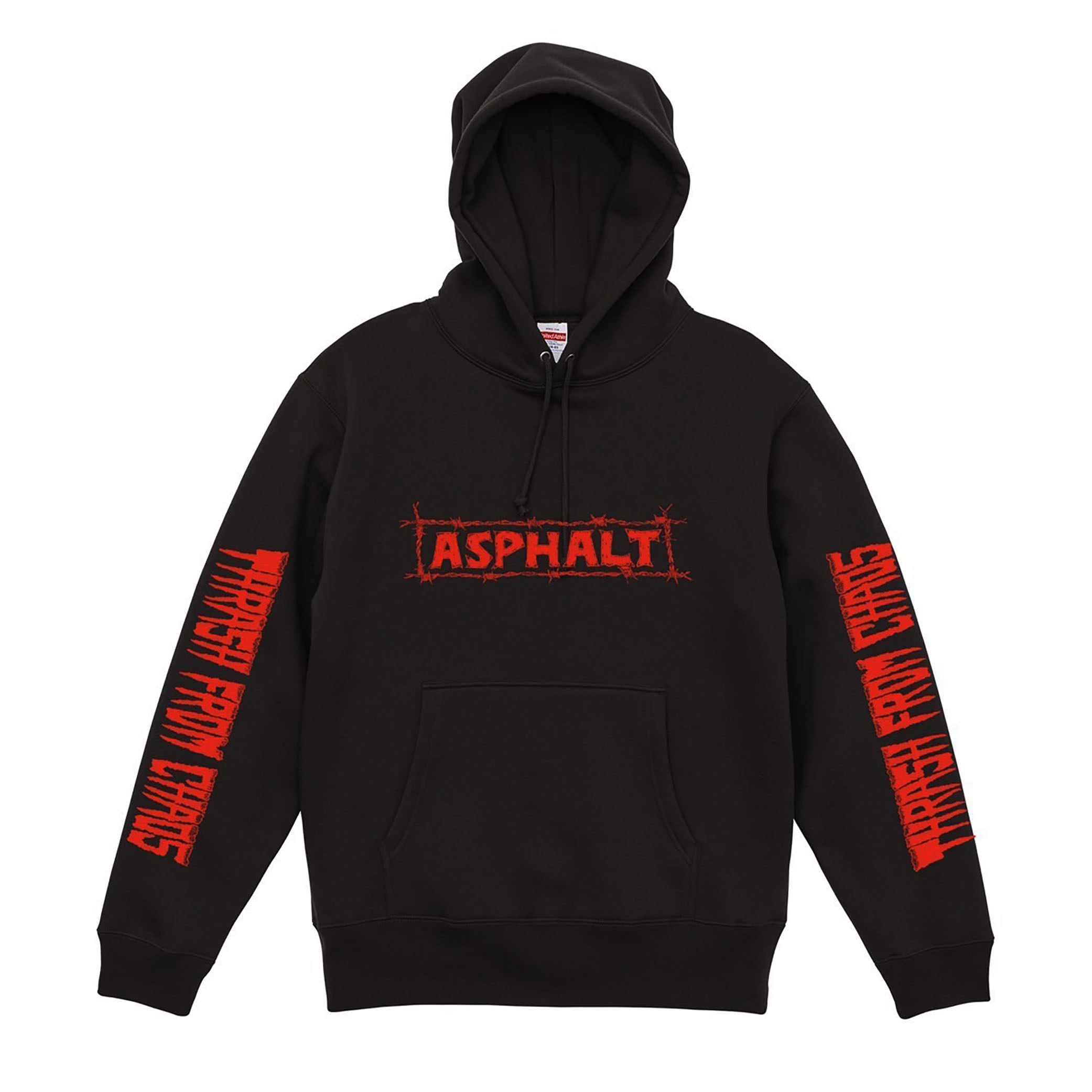 BAD BRAINSよろしく、雷に打たれ突如、筆をとり始めたヤスキ(GODDAMN DA HAA)による新作デザイン「パーフェクトサークル」をバックに、フロント「ASPHALT クラシックロゴ リメイク」、両袖には「THRASH FROM CHAOS」ロゴを配した豪華プリント・プルオーバー パーカ!